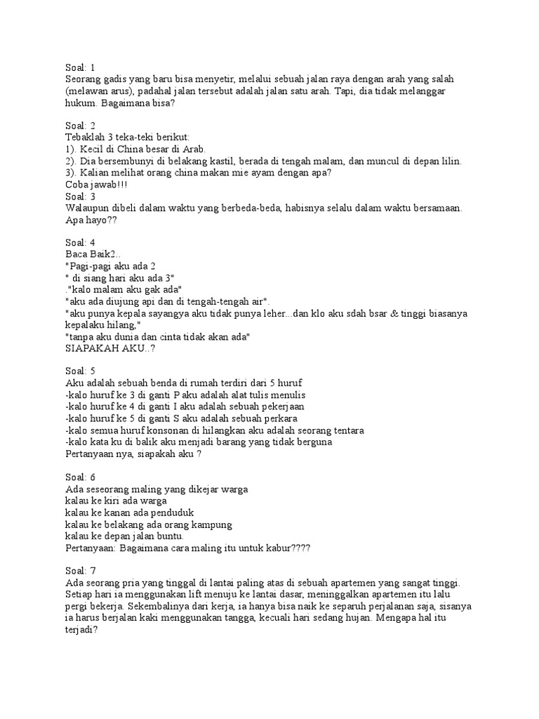 Seorang bapa dan anak lelaki sedang dalam perjalanan untuk berkhemah namun terlibat dalam kemalangan yang teruk. Apa perbedaan antara jatuh dari pohon kelapa dan jatuh ke dalam sumur? Seorang pria terjebak di dalam gua, ia kebingungan karena gua tersebut gelap. Contoh teka teki ada lima orang dalam lif yang bermanfaat pelbagai 5 baik kaki ayam terbaik untuk para ibubapa senarai berguna murid. Teka teki itu sangat mudah, jawabannya orang tuli, orang bisu.